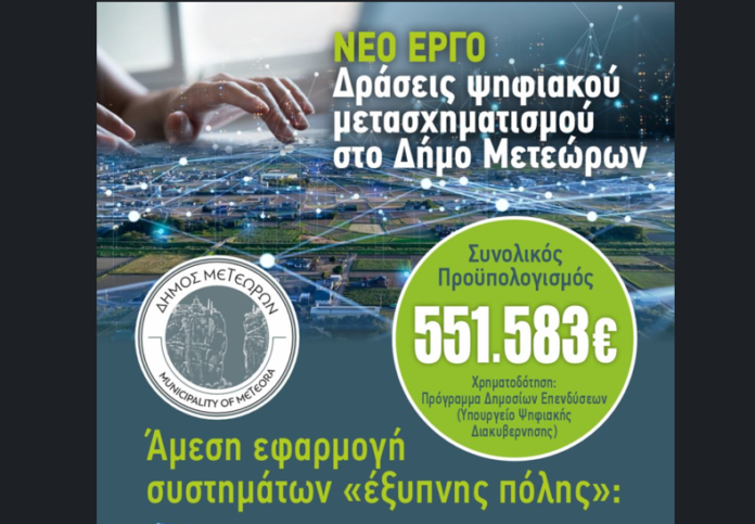 Με απόφαση του Υπουργού Ψηφιακής Διακυβέρνησης Δημήτρη Παπαστεργίου, εντάχθηκε στο Πρόγραμμα Δημοσίων Επενδύσεων το έργο «Δράσεις Ψηφιακού Μετασχηματισμού στο Δήμο Μετεώρων», συνολικού προϋπολογισμού 551.583 €, με χρηματοδότηση από το Υπουργείο Ψηφιακής Διακυβέρνησης.