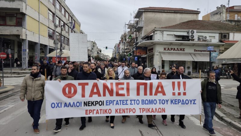Η κινητοποίηση ολοκληρώθηκε με μαχητική πορεία στους κεντρικούς δρόμους των Τρικάλων όπου κυριάρχησαν τα συνθήματα «Κέρδη βουτηγμένα στων εργατών το αίμα», «Εσείς μετράτε κέρδη και ζημιές – Εμείς μετράμε ανθρώπινες ζωές», «Η ανάπτυξη τους τσακίζει τη ζωή μας, οργάνωση κι αγώνας η απάντηση μας».