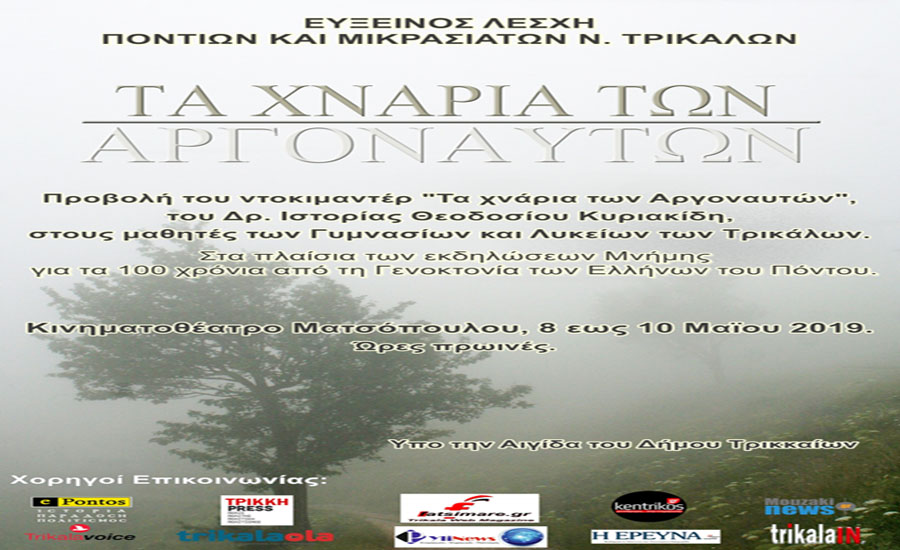 Το 2019 συμπληρώνονται 100 χρόνια από την έναρξη της δεύτερης και πιο σκληρής φάσης της Γενοκτονίας των Ελλήνων του Πόντου. Κατά το επετειακό αυτό έτος Μνήμης, η Εύξεινος Λέσχη Ποντίων και Μικρασιατών Ν. Τρικάλων θα πραγματοποιήσει σειρά εκδηλώσεων, μια εκ των οποίων είναι η προβολή του ντοκιμαντέρ «Στα Χνάρια των Αργοναυτών», του Δρ. Ιστορίας Θεοδοσίου Κυριακίδη, στους μαθητές των Γυμνασίων και Λυκείων της πόλης των Τρικάλων.