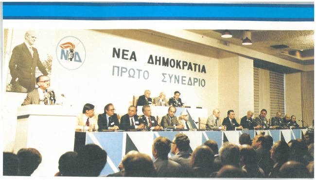 Το Α’ Συνέδριο του κόμματος που πραγματοποιήθηκε στη Χαλκιδική από τις 5 έως τις 7 Μαϊου του 1979, καθόρισε ουσιαστικά τον χαρακτήρα και τις θεμελιώδεις αρχές της Νέας Δημοκρατίας μέχρι και σήμερα και είναι το πρώτο συνέδριο κόμματος στην Ελλάδα του οποίου οι σύνεδροι ήταν αιρετοί από τα μέλη.