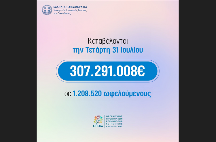 Το Υπουργείο Κοινωνικής Συνοχής και Οικογένειας, με τον εποπτευόμενο Οργανισμό Προνοιακών Επιδομάτων και Κοινωνικής Αλληλεγγύης (ΟΠΕΚΑ), ενημερώνουν ότι την Τετάρτη 31/8, θα καταβληθούν τα επιδόματα για τον μήνα Ιούλιο, συνολικού ύψους 307.291.008 ευρώ.