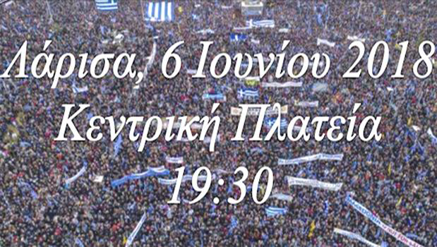 Την Τετάρτη 6 Ιουνίου & ώρα 19:30,  δηλώνουμε όλοι μας παρόν στο συλλαλητήριο που θα πραγματοποιηθεί στη Λάρισα,  ενάντια στο σφετερισμό του ονόματος της Μακεδονίας μας από τα Σκόπια. Το εν λόγω συλλαλητήριο ουδεμία σχέση έχει με κόμματα.