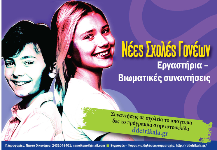 Για πληροφορίες και εγγραφές για τη Σχολή Γονέων της Διεύθυνσης Δευτεροβάθμιας Εκπαίδευσης Τρικάλων μπορείτε να απευθύνεστε στην κα Νάνσυ Οικονόμου, 2431046401, nanoikono@gmail.com και στην ειδική φόρμα: