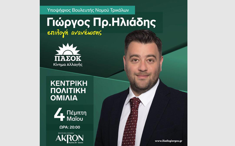 Ο υποψήφιος βουλευτής του ΠΑΣΟΚ Γιώργος Ηλιάδης διοργανώνει την κεντρική του προεκλογική του  εκδήλωση την Πέμπτη 4 Μαΐου και ώρα 8:00 το βράδυ, στη Μουσική Σκηνή ΑΚΡΟΝ STAGE, στην οδό Αμαλίας 59 (παραποταμίως, πριν το μαιευτήριο), όπου  θα πραγματοποιήσει πολιτική ομιλία.