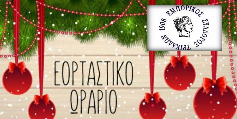Ο Εμπορικός Σύλλογος Τρικάλων ενημερώνει τους συναδέλφους και το καταναλωτικό κοινό ότι το προτεινόμενο χριστουγεννιάτικο ωράριο για την αγορά των Τρικάλων ξεκινά από την Παρασκευή 16 Δεκεμβρίου 2022 και είναι το παρακάτω: