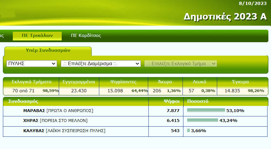 Απόλυτος κυρίαρχος του παιχνιδιού για την επόμενη 5ετία, θα είναι και πάλι ο νυν και νεοκλεγέντας Δήμαρχος Κώστας Μαράβας, ύστερα από άλλη μια συντριπτική νίκη, συγκεντρώνοντας ποσοστό 53,10%, έναντι 43,24% του Θ. Χήρα και 3,66% και 17, 11 και 1 έδρες, αντίστοιχα.