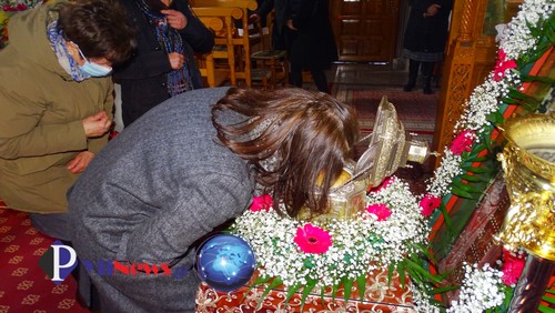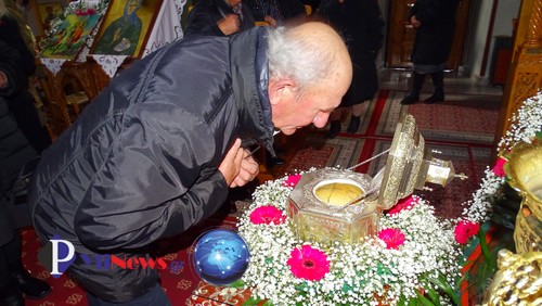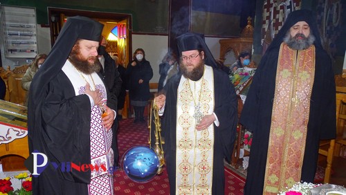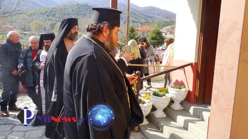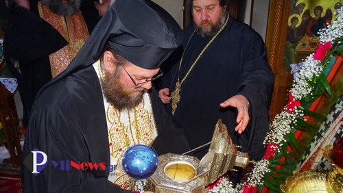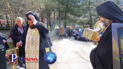 Εκεί την υποδέχτηκαν ο Καθηγούμενος της Ι.Μ. Αγ. Προκοπίου Διονύσιος Κλάδης, ο Αρχιμανδρίτης της ιδίας Μονής Αρχιμανδρίτης Προκόπιος & ο οικοδεσπότης ιερέας π. Βασ. Πανάγος, ενώ στην συνέχεια ετελέσθη Μέγας Πανηγυρικός Εσπερινός μετ’ αρτοκλασίας, Θείου Κηρύγματος & η ακολουθία του Υψώματος του Αγίου.