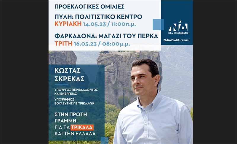 O Υπουργός Περιβάλλοντος και Ενέργειας και υποψήφιος βουλευτής Τρικάλων, Κώστας Σκρέκας, θα απευθύνει ομιλία την Κυριακή 14 Μαΐου 2023, στις 11:00 το πρωί, στο Πολιτιστικό Κέντρο Πύλης και την…
