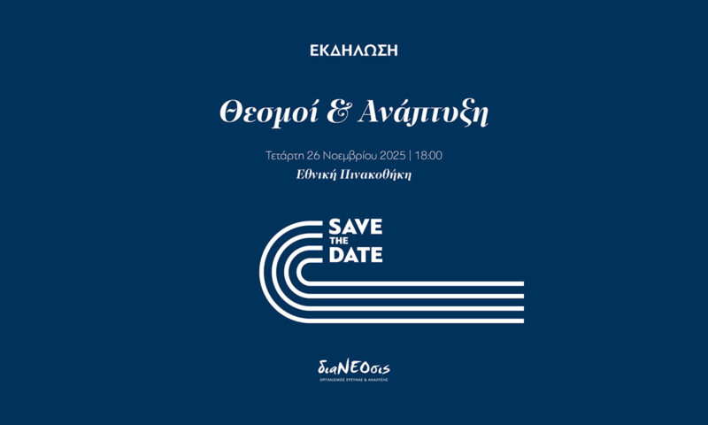 | SAVE THE DATE | Η διαΝΕΟσις διοργανώνει δημόσια εκδήλωση με τίτλο “Θεσμοί και Ανάπτυξη“, την Τετάρτη 26 Νοεμβρίου 2025 στις 18:00 στην Εθνική Πινακοθήκη, αμφιθέατρο “Ίδρυμα Ωνάση” (Βασ. Κωνσταντίνου 50, 116 34, Αθήνα). Από την ίδρυσή της, η διαΝΕΟσις επιδιώκει σταθερά να συμβάλει ενεργά στον δημόσιο διάλογο γύρω από τον εκσυγχρονισμό των θεσμών και την άρση των εμποδίων για βιώσιμη ανάπτυξη με κοινωνική συνοχή και ευημερία. Η εκδήλωση αυτή πραγματοποιείται με αφορμή την ολοκλήρωση της σειράς δράσεων που διοργάνωσε η διαΝΕΟσις για τη Συνταγματική Αναθεώρηση, καθώς και την πραγματοποίηση, σε συνεργασία με το Εθνικό Κέντρο Κοινωνικών Ερευνών (ΕΚΚΕ), του λληνικού μέρους της World Values Survey. Κατά την εκδήλωση, θα παρουσιαστεί και θα διανεμηθεί το νέο βιβλίο της διαΝΕΟσις με τίτλο “Προτάσεις για τη Συνταγματική Αναθεώρηση“. Μπορείτε να δηλώσετε συμμετοχή στην εκδήλωση εδώ: |