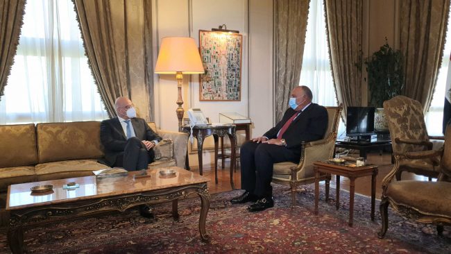 Περισσότερο από μία ώρα διήρκησε σήμερα το απόγευμα η κατ’ ιδίαν συνάντηση που είχε στο Κάιρο ο υπουργός Εξωτερικών Νίκος Δένδιας με τον Αιγύπτιο ομόλογό του, Σάμεχ Σούκρι, από τον οποίο έγινε θερμά δεκτός κατά την άφιξή του στην είσοδο του κτιρίου του υπουργείου Εξωτερικών της Αιγύπτου.