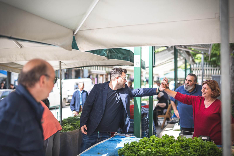 Παραγωγοί μικροπωλητές και πολίτες υποδέχθηκαν τον υποψήφιο βουλευτή με μια μεγάλη αγκαλιά και χαμόγελα, γεγονός που επιβεβαιώνει την δυναμική του, τόσο στην πόλη, όσο και στα χωριά.