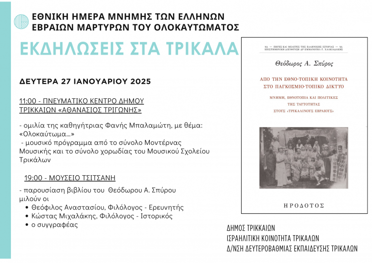 Η παρουσίαση αυτή εντάσσεται στο πλαίσιο των εκδηλώσεων που διοργανώνει η Ισραηλιτική Κοινότητα Τρικάλων για τη Διεθνή Ημέρα Μνήμης Θυμάτων του Ολοκαυτώματος.