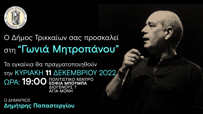 Τη δική του θέση στην τρικαλινή μουσική ιστορία αποκτά ο Δημήτρης Μητροπάνος. Την Κυριακή 11 Δεκεμβρίου 2022 στις 19:00, εγκαινιάζεται η «Γωνιά Μητροπάνου», στην οδό Διογένους 7, στην Αγία Μονή, τη γενέτειρα συνοικία.