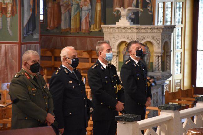 Ø στα Τρίκαλα, χοροστάτησε ο Σεβασμιότατος Μητροπολίτης Τρίκκης, Γαρδικίου και Πύλης, κ.κ. Χρυσόστομος, ενώ παρέστησαν ο Θεματικός Αντιπεριφερειάρχης Περιβάλλοντος, Χωρικού Σχεδιασμού και Πολιτικής Γης, Κωνσταντίνος Μπάρδας, ο Αντιδήμαρχος του Δήμου Τρικκαίων, Γεώργιος Ζιώγας, ο Διοικητής της Σχολής Μονίμων Υπαξιωματικών (Σ.Μ.Υ.), Ταξίαρχος Κωνσταντίνος Δαλάκης, ο Διοικητής της Πυροσβεστικής Υπηρεσίας Τρικάλων, Πύραρχος Δημήτριος Γαλάνης, ο Πρόεδρος της Ένωσης Αποστράτων νομού Τρικάλων, Ιωάννης Διαμάντης, εκπρόσωποι της Ένωσης Αστυνομικών Υπαλλήλων Τρικάλων, ο Πρόεδρος της Εβραϊκής Κοινότητας Τρικάλων, Ιακώβ Βενουζίου, η Προϊσταμένη της Δημοτικής Αστυνομίας Τρικάλων, η Διευθύντρια της Τοπικής Μονάδας Υγείας (Τ.Ο.Μ.Υ.) Τρικάλων, καθώς και εν ενεργεία αστυνομικοί.