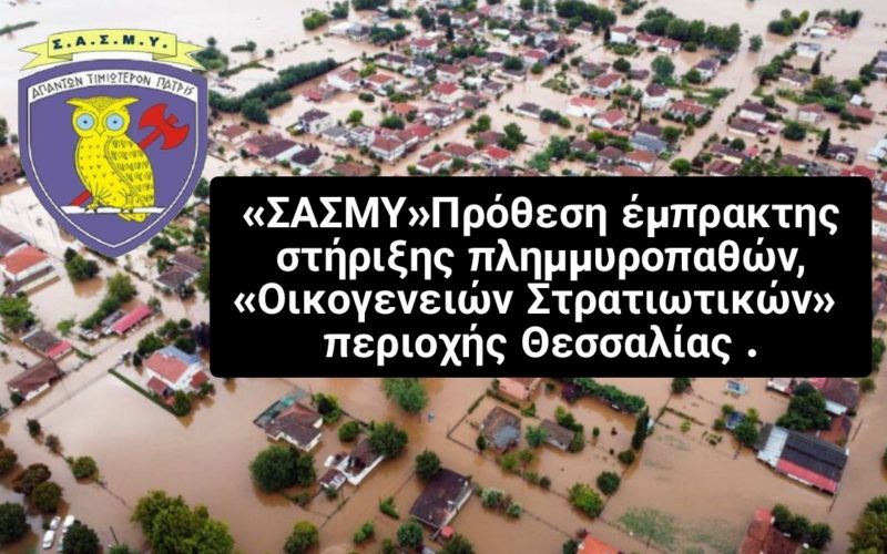 ΥΓ: Eπειδή η ανακοίνωσή μας μπορεί να μην γίνει αντιληπτή από όλους τους συναδέλφους στρατιωτικούς που έχουν πληγεί από την θεομηνία παρακαλούμε όσοι γνωρίζετε κάποιους που έχουν πρόβλημα να τους ενημερώσετε δίνοντας τους τα στοιχεία επικοινωνίας του ΣΑΣΜΥ ώστε να έρθουν σε επαφή με τον σύνδεσμο, για παροχή βοήθειας.