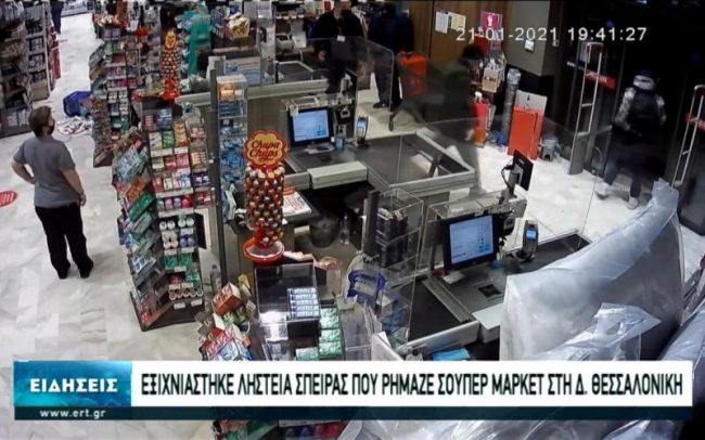 Όπως φαίνεται σε video ντοκουμέντο που μετέδωσε η ΕΡΤ3 από ληστεία σε σούπερ μάρκετ στο Κορδελιό, ληστές με καραμπίνες στα χέρια έχουν εισβάλει στο κατάστημα και με πρωτοφανή αγριότητα δε διστάζουν να σηκώσουν τα όπλα απειλώντας υπαλλήλους και πελάτες.