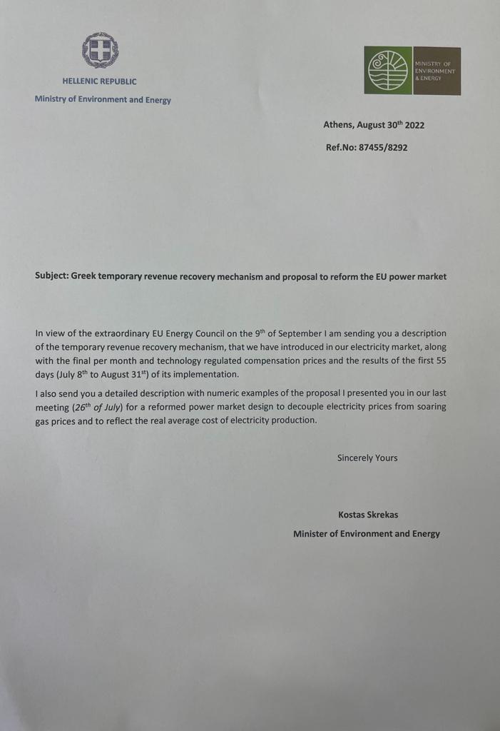 Επίσης, ο κ. Σκρέκας, στην επιστολή του, αναφέρθηκε, με συγκεκριμένα ποσοτικά παραδείγματα, στην πρόταση που παρουσίασε στο Συμβούλιο Υπουργών Ενέργειας στις 26 Ιουλίου, για έναν μόνιμο ευρωπαϊκό μηχανισμό που αποσυνδέει τις τιμές φυσικού αερίου από αυτές του ηλεκτρικού ρεύματος.