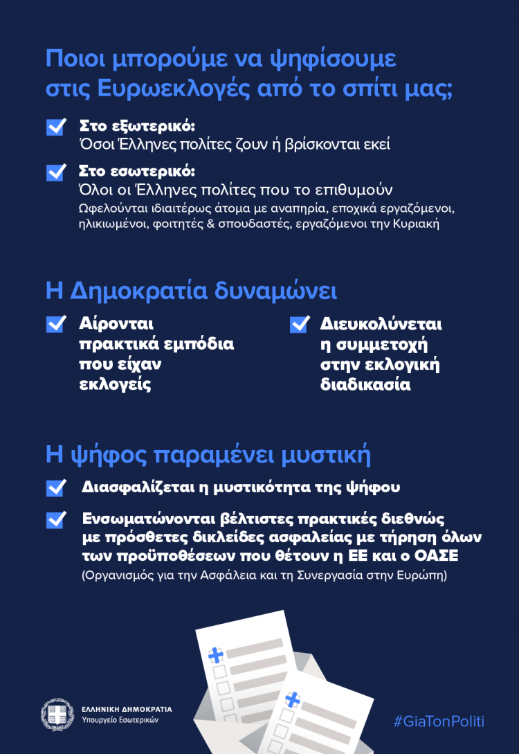 Πλέον, Έλληνες πολίτες εγγεγραμμένοι στους εκλογικούς καταλόγους, θα μπορούν να ψηφίσουν από το σπίτι τους, σε Ευρωεκλογές και δημοψηφίσματα.