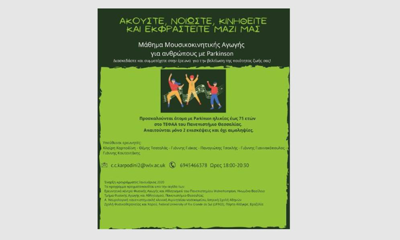 Στο πλαίσιο έρευνας του ΤΕΦΑΑ Τρικάλων, προσκαλούνται να συμμετάσχουν άτομα ηλικίας έως και 75 ετών που διαγνώστηκαν με την νόσο του Πάρκινσον.