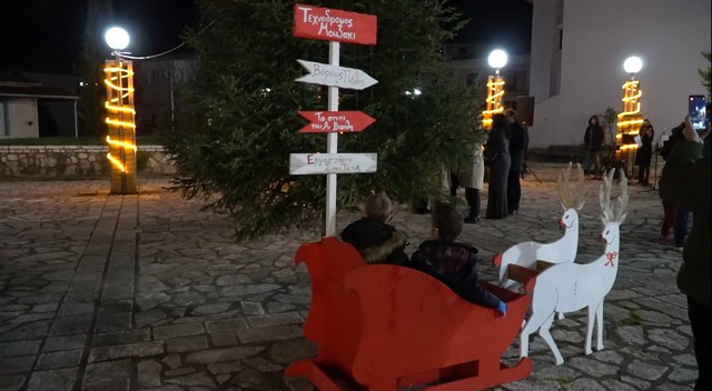 Σε περίοπτες θέσεις δε είχαν τοποθετηθεί κοντά στο δένδρο στολισμένα, η Χριστουγεννιάτικη φάτνη και ένα αυτοσχέδιο έλκηθρο που προσέλκυσε ιδιαίτερα το ενδιαφέρον των παιδιών.