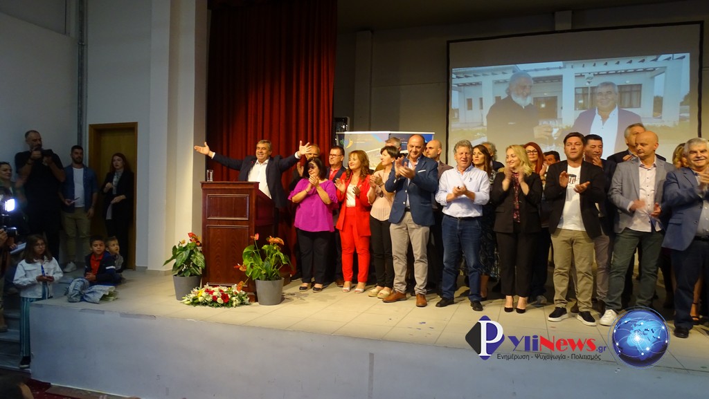 Κλείνοντας και μέσα σε πανηγυρικό κλίμα, παρουσίασε τους 75 υποψήφιους δημοτικούς του συμβούλους και στη συνέχεια τους Τοπικούς και Δημοτικούς Συμβούλους της Δ.Ε. Πύλης.