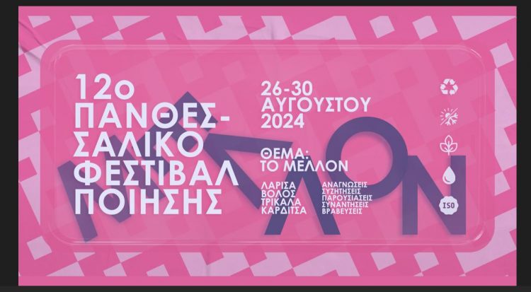 Το 12ο Πανθεσσαλικό Φεστιβάλ Ποίησης θα πραγματοποιηθεί μεταξύ 26 και 30 Αυγούστου στην Λάρισα, τον Βόλο (Μακρινίτσα), τα Τρίκαλα και την Καρδίτσα (Λίμνη Πλαστήρα).