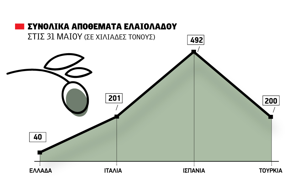 Αντίστοιχα τα αποθέµατα στην Ελλάδα, πλέον είναι κάτω των 40.000 τόνων, µε τις πιο σοβαρές ποσότητες να συγκεντρώνονται στη Λακωνία. Μέσα σε όλα αυτά, η Τουρκία διαθέτει περίπου 200.000 τόνους ελαιολάδου -κυρίως λαµπάντε.