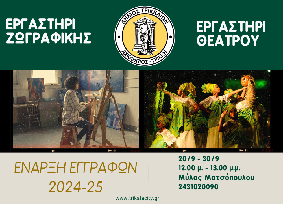 Ο Δήμος Τρικκαίων και το Δημοτικό Θέατρο Τρικάλων λειτουργούν και φέτος τα καλλιτεχνικά εργαστήρια θεάτρου και ζωγραφικής για παιδιά, εφήβους νέους και ενήλικες.