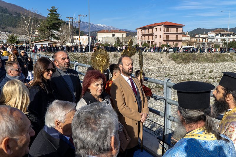 Στη συνέχεια ακολούθησε ο Αγιασμός των Υδάτων στον ποταμό Πάμισο, στην πεζογέφυρα Μουζακίου, χοροστατούντος του πρωτοπρεσβύτερου π. Λάζαρου Κουτσογιάννη, παρουσία του Δημάρχου Μουζακίου και εορτάζοντα κ. Θεοφάνη Στάθη, της Προέδρου Δημοτικού Συμβουλίου, αντιδημάρχων, μελών του Δημοτικού Συμβουλίου, του προέδρου Μουζακίου, εκπροσώπων τοπικών συλλόγων και φορέων, Διοικήσεων των Σωμάτων Ασφαλείας Μουζακίου και εκατοντάδων δημοτών, δεδομένου ότι ο καιρός ήταν ευνοϊκός με ηλιοφάνεια και υψηλή θερμοκρασία.