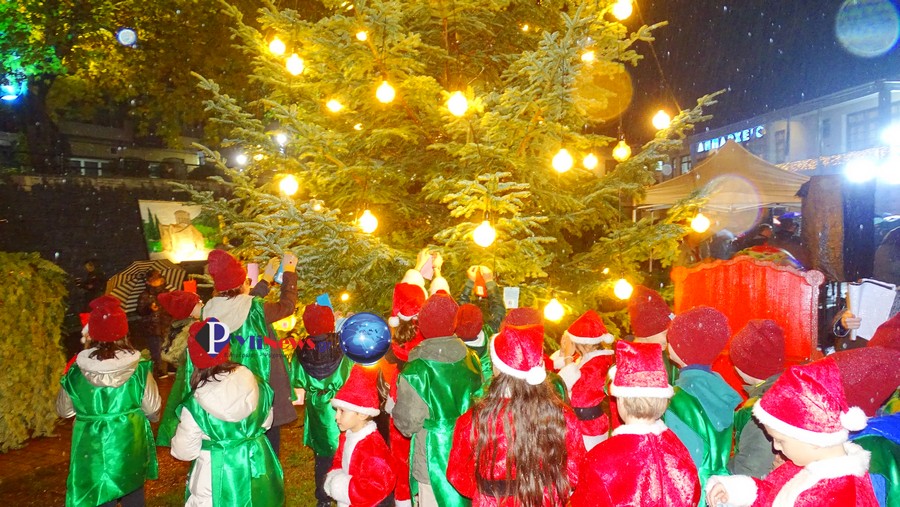 Η εκδήλωση άνοιξε με την φωταγώγηση του τεράστιου Χριστουγεννιάτικου Δέντρου, με τον κόσμο να μετράει αντίστροφα για τον φωτισμό από τον Δήμαρχο Πύλης κ. Κ. Μαράβα και τον πορτινό ουρανό να γίνεται μέρα από την ρίψη των βεγγαλικών, που ενθουσίασαν μικρούς και μεγάλους.