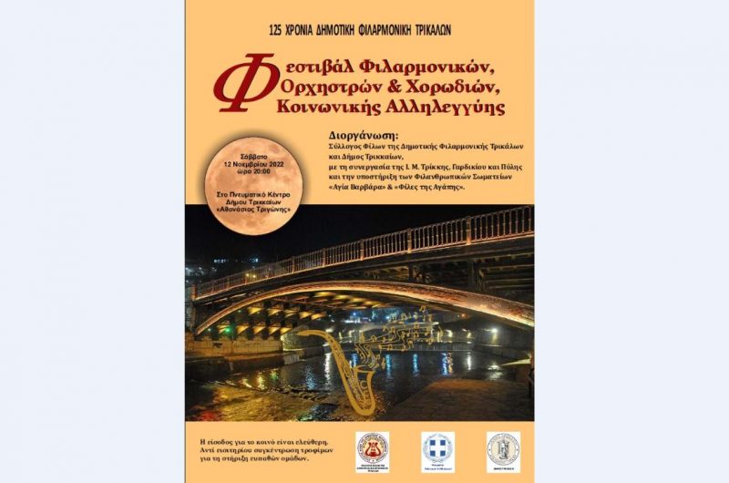 Μια μεγάλη συναυλία κοινωνικής αλληλεγγύης πραγματοποιείται το διήμερο 12 και 13 Νοεμβρίου 2022 από τον Δήμο Τρικκαίων και τον Σύλλογο Φίλων της Δημοτικής Φιλαρμονικής Τρικάλων.