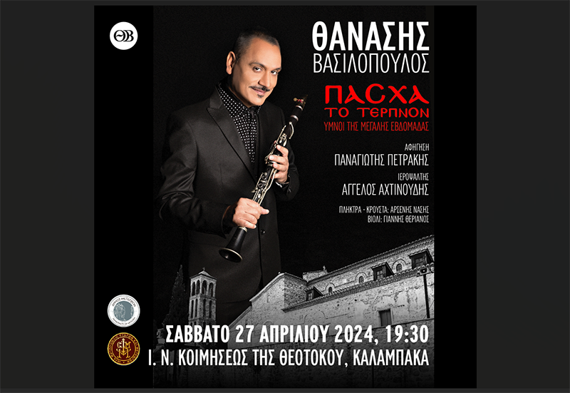 Με έμπνευση από τα έθιμα και το κατανυκτικό κλίμα των Άγιων Ημερών του Πάσχα, η Ιερά Μητρόπολη Σταγών και Μετεώρων και ο Δήμος Μετεώρων σας προσκαλούν να συμμετέχετε στην μεγάλη συναυλία «Πάσχα το Τερπνόν- Ύμνοι της Μεγάλης Εβδομάδας» υπό τους ήχους του δεξιοτέχνη του κλαρίνου Θανάση Βασιλόπουλου.