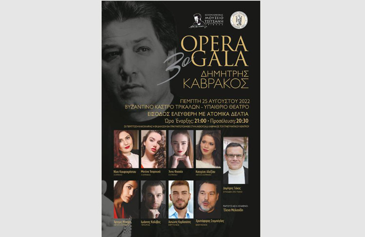 Για τρίτη χρονιά τα Τρίκαλα φιλοξενούν ένα εξαίσιο Gala όπερας με ερμηνευτές/τριες και μουσικούς διεθνούς φήμης. Το 3ο Opera Gala «Δημήτρης Καβράκος», υλοποιείται με βάση τη μουσική διδασκαλία, προσφορά και κύρος του τρικαλινού μονωδού και βαθύφωνου, Δημήτρη Καβράκου.
