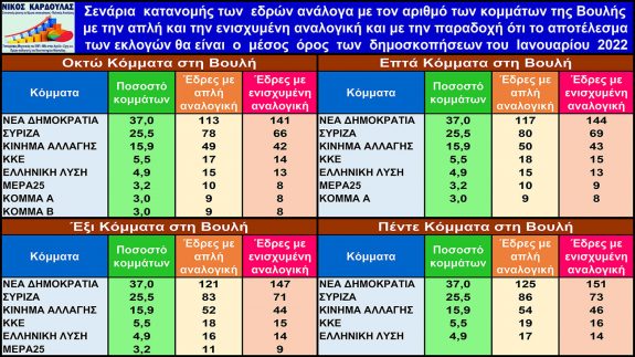 Σύμφωνα με το μέσο όρο των πέντε δημοσκοπήσεων που πραγματοποιήθηκαν από 1 έως 31 Ιανουαρίου 2022 και με την παραδοχή ότι αυτό θα είναι και το αποτέλεσμα των εκλογών, με το νόμο της απλής αναλογικής δεν σχηματίζεται αυτοδύναμη κυβέρνηση, ενώ με το νέο εκλογικό νόμο της ενισχυμένης αναλογικής η Νέα Δημοκρατία σχηματίζει οριακά αυτοδύναμη κυβέρνηση (151 έδρες) μόνο σε περίπτωση πεντακομματικής Βουλής.