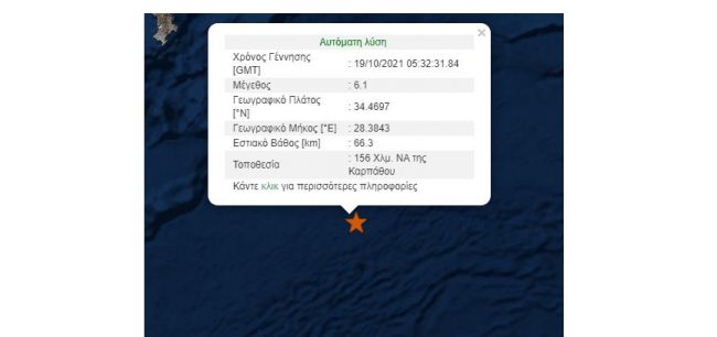 Νέος ισχυρός σεισμός μεγέθους 6,1 βαθμών της κλίμακας Ρίχτερ σημειώθηκε στις 8:32 ανοιχτά της Καρπάθου, σύμφωνα με το Γεωδυναμικό Ινστιτούτο Αθηνών.