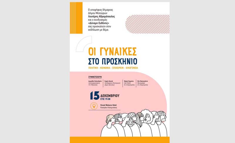 Ο υποψήφιος Δήμαρχος Δήμου Μετεώρων, Λευτέρης Αβραμόπουλος και ο συνδυασμός «Δύναμη Ευθύνης» προσκαλούν όλες και όλους στην εκδήλωση, με θέμα «Οι γυναίκες στο προσκήνιο», στην πολιτική, στην κοινωνία, στο επιχειρείν, στην οικογένεια.