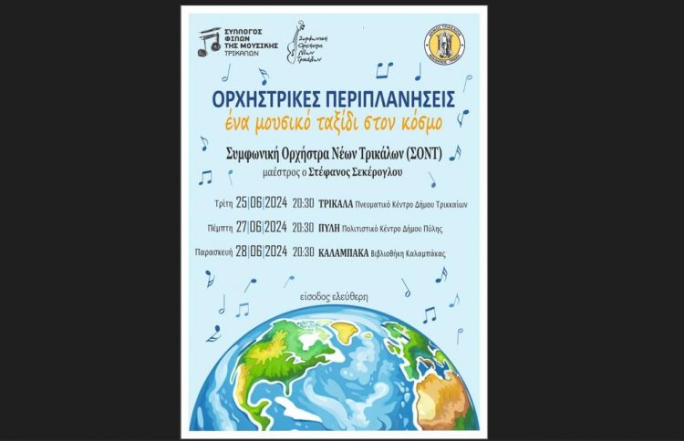 Το πρόγραμμα, με μαέστρο τον Στέφανο Σεκέρογλου, περιλαμβάνει έργα σπουδαίων συνθετών επηρεασμένα από μουσικές παραδόσεις από διάφορες περιοχές του κόσμου. Τη συναυλία διοργανώνει ο Σύλλογος Φίλων Μουσικής Τρικάλων σε συνεργασία με τον Δήμο Τρικκαίων, τη Βιβλιοθήκη Καλαμπάκας και τον Δήμο Πύλης.