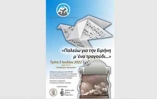 Την Τρίτη 5 Ιουλίου 2022 και ώρα 21:15 στην αρχή της οδού Ασκληπιού θα πραγματοποιηθεί εκδήλωση αφιέρωμα στην ΕΙΡΗΝΗ. Την εκδήλωση διοργανώνει το Meteora Wrestling Academy μαζί με το Δήμο Τρικκαίων και το Δημοτικό Ωδείο Τρικάλων.