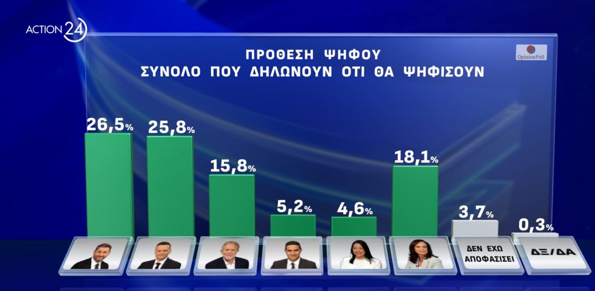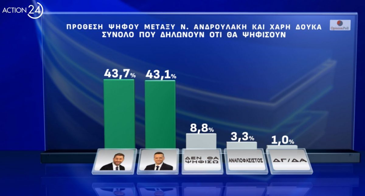 Τελευταία χρονικά παρουσιάστηκε η δημοσκόπηση της Opinion Poll που παρουσιάστηκε στο κεντρικό δελτίο του Action 24. Σύμφωνα με τα ευρήματα οδηγούμαστε στην τελική ευθεία σε ντέρμπι μεταξύ Ανδρουλάκη και Δούκα με τον πρώτο να έχει ένα μικρό προβάδισμα.