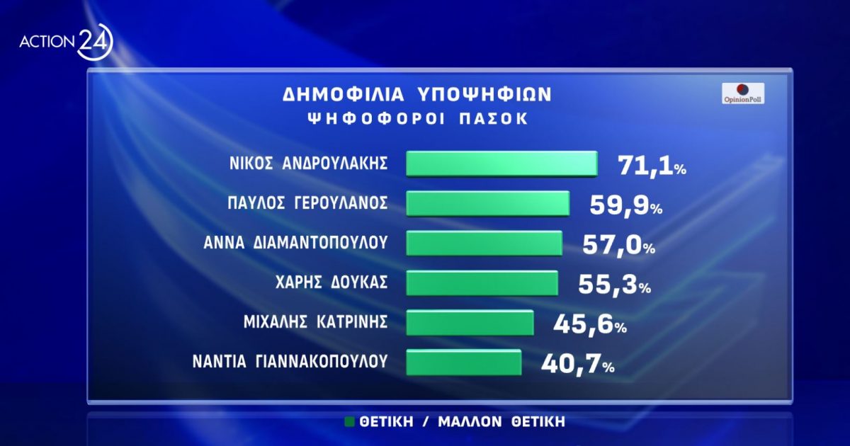 Ανάμεσα στους ψηφοφόρους του ΠΑΣΟΚ είναι: Ανδρουλάκης 71.1%, Γερουλάνος 59.9%, Διαμαντοπούλου 57%, Δούκας 55.3%, Κατρίνης 45.6%, Γιαννακοπούλου 40.7%.