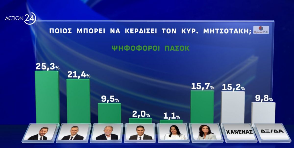 Στους ψηφοφόρους ΠΑΣΟΚ: 25.3% λέει ο Νίκος Ανδρουλάκης, 21.4% ο Χάρης Δούκας 15.7% η Άννα Διαμαντοπούλου, 9.5% ο Παύλος Γερουλάνος, με το 15.2% να δηλώνει Κανένας και τον Μιχάλη Κατρίνη και την Νάντια Γιαννακοπούλου 2 και 1,1% αντίστοιχα.