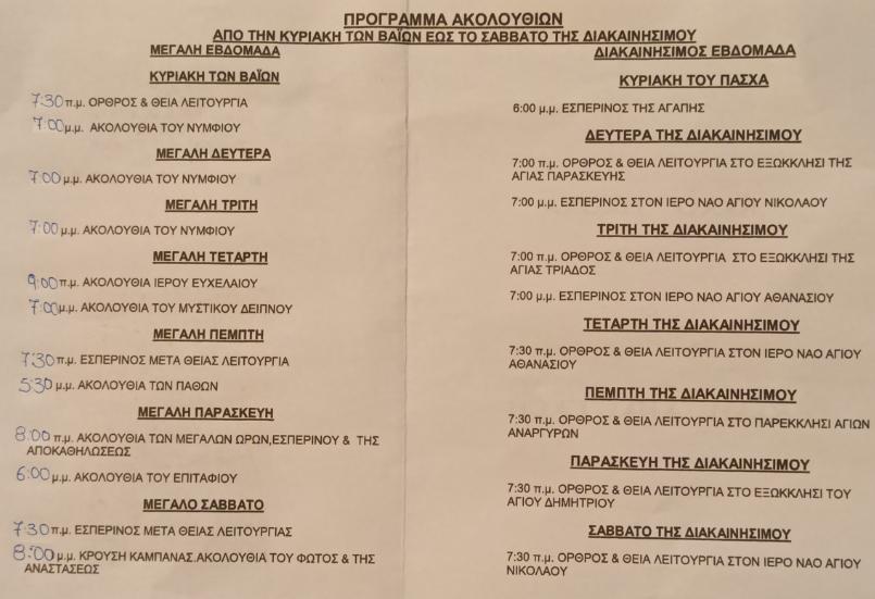 Το πρόγραμμα ακολουθιών του Ι.Ν. Αγ. Νικολάου Γόμφων, τις ημέρες του Πάσχα
