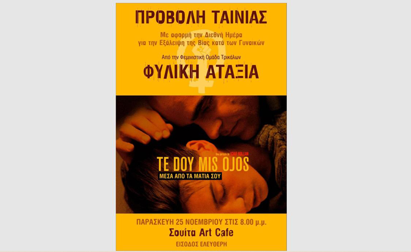 Με αφορμή την ημέρα, σας προσκαλούμε όλες και όλους να παρακολουθήσουμε (με ελεύθερη είσοδο) την προβολή μιας πολυβραβευμένης ισπανικής ταινίας στο φιλόξενο χώρο της Σουίτας Art Cafe, την Παρασκευή 25/11 στις 8.00μμ και, αν έχουμε διάθεση, να την συζητήσουμε.