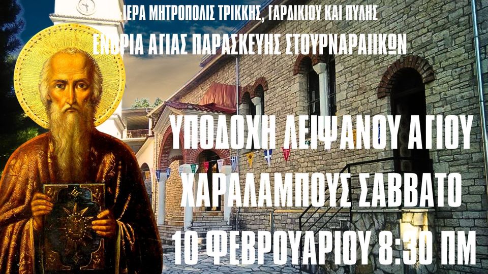 Το Σάββατο 10 Φεβρουαρίου στις 8:30 το πρωί, υποδοχή ΙΕΡΟΥ ΛΕΙΨΑΝΟΥ ΤΟΥ ΑΓΙΟΥ ΧΑΡΑΛΑΜΠΟΥΣ στα Προπύλαια του ΙΕΡΟΥ ΝΑΟΥ ΑΓΙΑΣ ΠΑΡΑΣΚΕΥΗΣ ΣΤΟΥΡΝΑΡΑΙΪΚΩΝ.