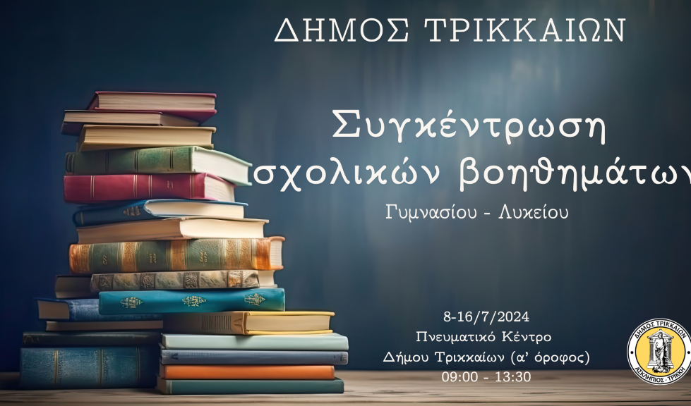 Ο Δήμος Τρικκαίων και το 2024 συγκεντρώνει βοηθήματα για μαθητές και μαθήτριες Γυμνασίου και Λυκείου. Σε μια προσπάθεια, αφ’ ενός να μην πεταχτούν βιβλία, αφ’ ετέρου να βοηθηθούν μαθητές/τριες που τα έχουν ανάγκη, ο Δήμος Τρικκαίων ζητά τη συνδρομή των πολιτών.