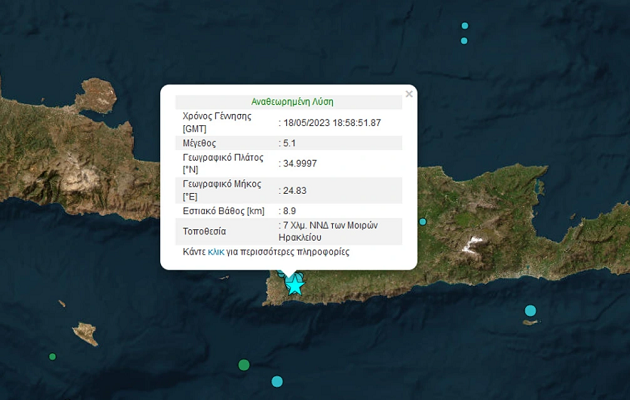 Σεισμός 5,1 Ρίχτερ σημειώθηκε στις 21.58 της Πέμπτης, στο νότιο τμήμα του νομού Ηρακλείου Κρήτης και έγινε αισθητός σε όλη την ανατολική Κρήτη.