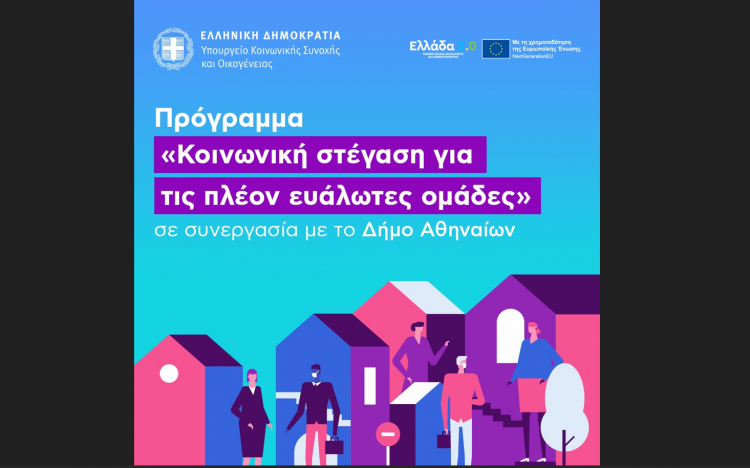 Το πρόγραμμα «Κοινωνική στέγαση για τις πλέον ευάλωτες ομάδες» υλοποιεί το Υπουργείο Κοινωνικής Συνοχής και Οικογένειας σε συνεργασία με το Δήμο Αθηναίων με συνολική χρηματοδότηση ύψους 1.032.114,00 ευρώ από πόρους του Εθνικού Σχεδίου Ανάκαμψης και Ανασυγκρότησης «Ελλάδα 2.0».