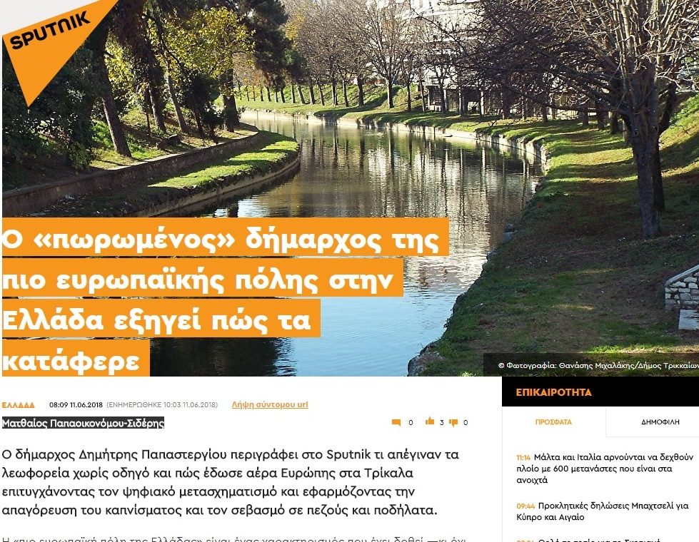 Σε ένα από τα μεγαλύτερα παγκοσμίως ειδησεογραφικά πρακτορεία, το ρωσικό Sputnik, παραχώρησε συνέντευξη Τύπου ο Δήμαρχος Τρικκαίων κ. Δημήτρης Παπαστεργίου,. Το γραφείο του πρακτορείου στην Ελλάδα μόλις άνοιξε, με ιστοσελίδα και ειδησεογραφική κάλυψη και ένα εκ των πρώτων θεμάτων που παρουσιάστηκαν, ήταν ο Δήμος Τρικκαίων και τα επιτεύγματά του. Η συνέντευξη στον δημοσιογράφο κ. Ματθαίο Παπαοικονόμου – Σιδέρη παρουσιάζει ιδιαίτερο ενδιαφέρον και αποκαλύπτει δείγματα της αλλαγμένης νοοτροπίας στον Δήμο: