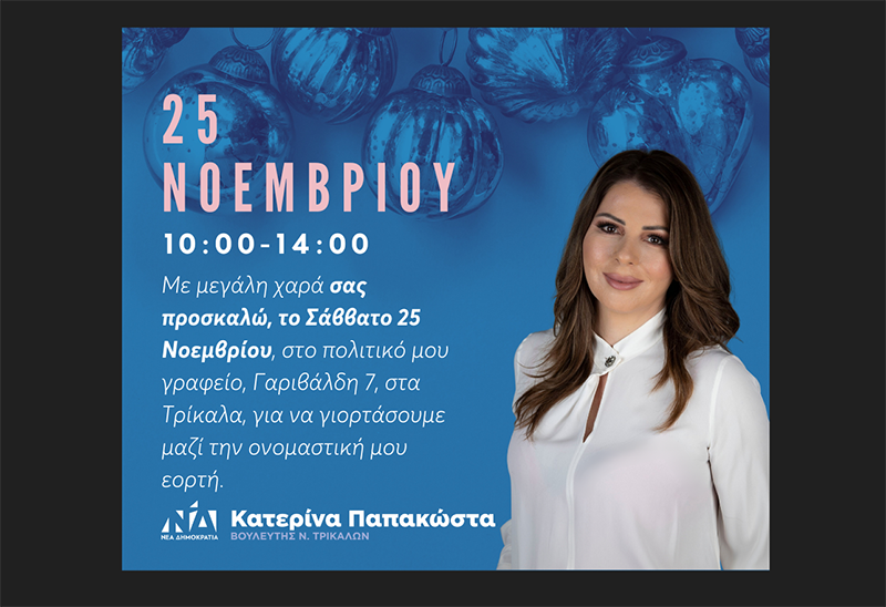 Στο Πολιτικό της Γραφείο στα Τρίκαλα, Γαριβάλδη 7, θα δεχθεί αύριο Σάββατο 25 Νοεμβρίου, ευχές για την ονομαστική της εορτή από φίλους, γνωστούς και αγαπημένα πρόσωπα, η βουλευτής της ΝΔ Τρικάλων κα Κατερίνα Παπακώστα κατά τις ώρες 10:00πμ – 2:00μμ.