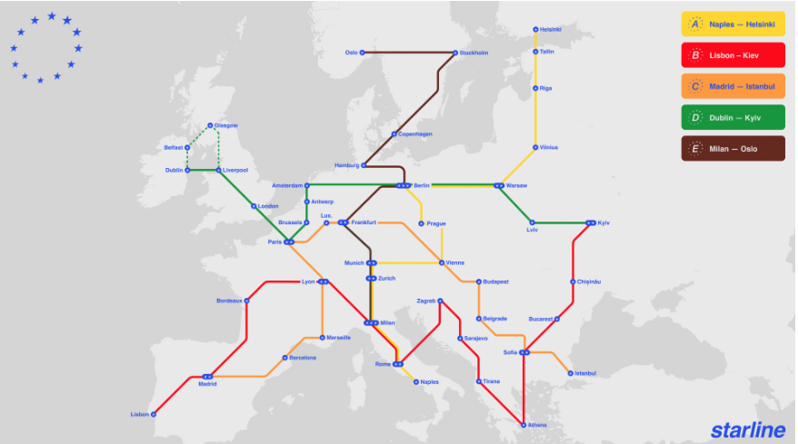 Η πρόταση της Starline περιλαμβάνει τη δημιουργία νέων υποδομών, σταθμών και τρένων – βαμμένων σε μπλε χρώμα, με ειδικούς χώρους για οικογένειες και «ήσυχα βαγόνια». Προβλέπει επίσης ενιαίο ευρωπαϊκό σύστημα έκδοσης εισιτηρίων, ώστε οι επιβάτες να μπορούν να ταξιδεύουν με ένα μόνο εισιτήριο σε ολόκληρη την ήπειρο.